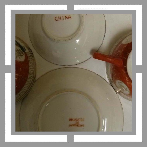 从这套瓷器中可以看到香港近代粉彩瓷器发展的一个缩影。从釉面加彩部分看, 所有瓷器没有太大的区别, 但是若从底款和瓷胎来仔细观察, 就会发现一些区别, 除了大部分为“Decorated in Hong Kong” 英文底款外, 小部分为英文底款 “CHINA”及两件茶杯为 “江西景德镇名瓷”; 还有三件“Decorated in Hong Kong” 英文底款的小碟是由“中国景德镇出品” 改款而来。从胎体来看, 所有“Decorated in Hong Kong” 英文底款瓷器胎体很薄, 应该为日本进口的机器压模胎, 英文底款为 “CHINA”及改款瓷器的胎体相对要厚重, 从胎底露胎处的旋转纹路可知,这些是由江西景德镇所提供的样品及白胎。而那两件茶杯的“江西景德镇名瓷”底款同标准的 “江西景德镇名瓷”是不同的, 看胎底瓷胎也不是来自江西景德镇, 应该为香港本地后加仿款。