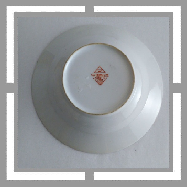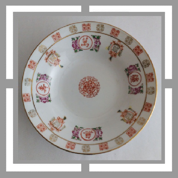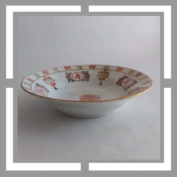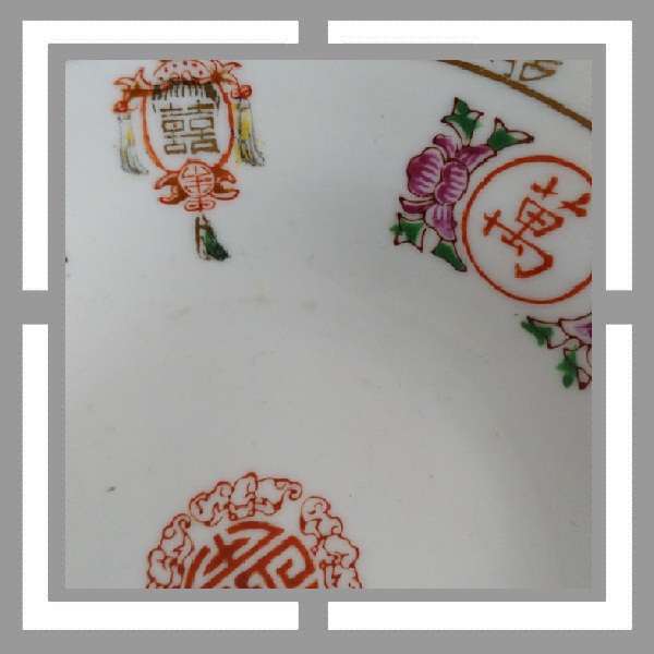 现代潮彩.万寿无疆字体的开光边框带有潮彩底款惯有的双框内加彩饰风格, 回型纹中也点缀上了花饰.