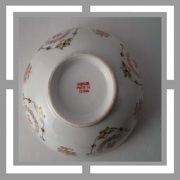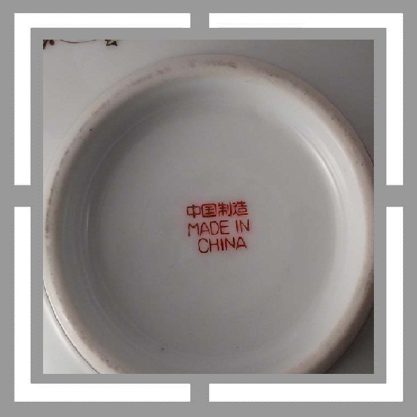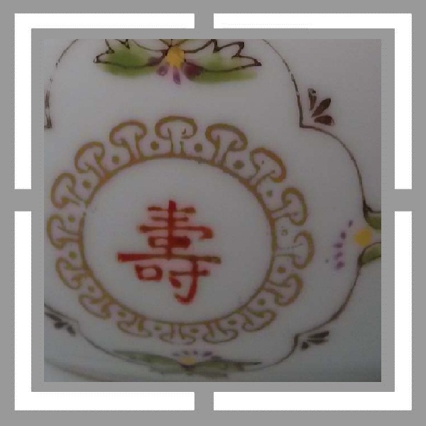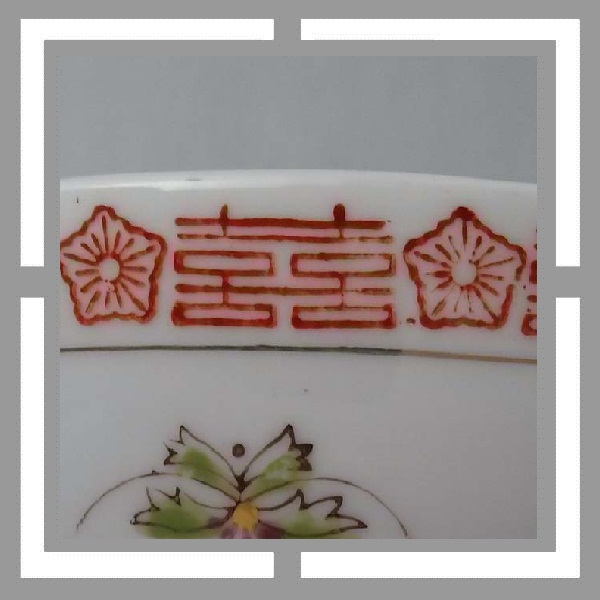 直径17.5厘米,现代潮彩.万寿无疆字体的开光边框带有潮彩底款惯有的双框内加彩饰风格, 回型纹中也点缀上了花饰.