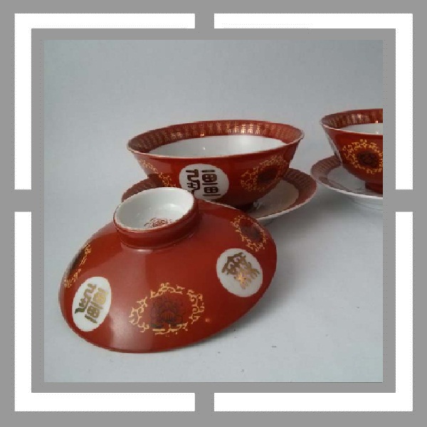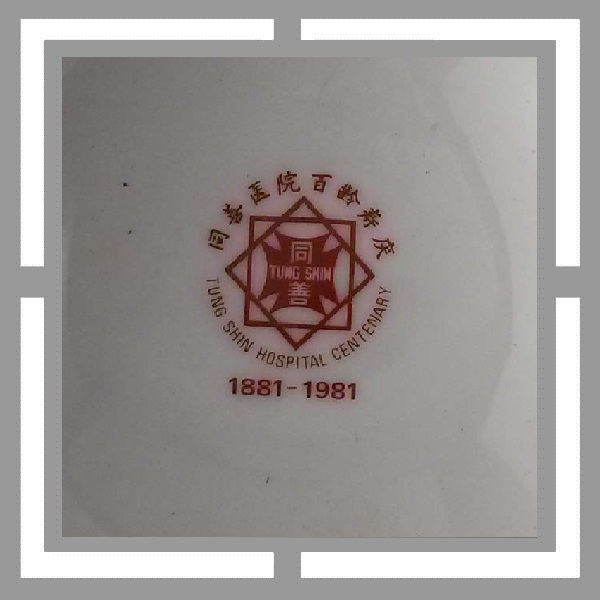 这套万寿无疆款茶杯为台湾大同瓷器公司在1981年同善医院百年成立所烧制的瓷器,徽章字体为"同善医院百龄寿庆",开光内的四个字体把常见的"万寿无疆"改变为"福寿无疆".